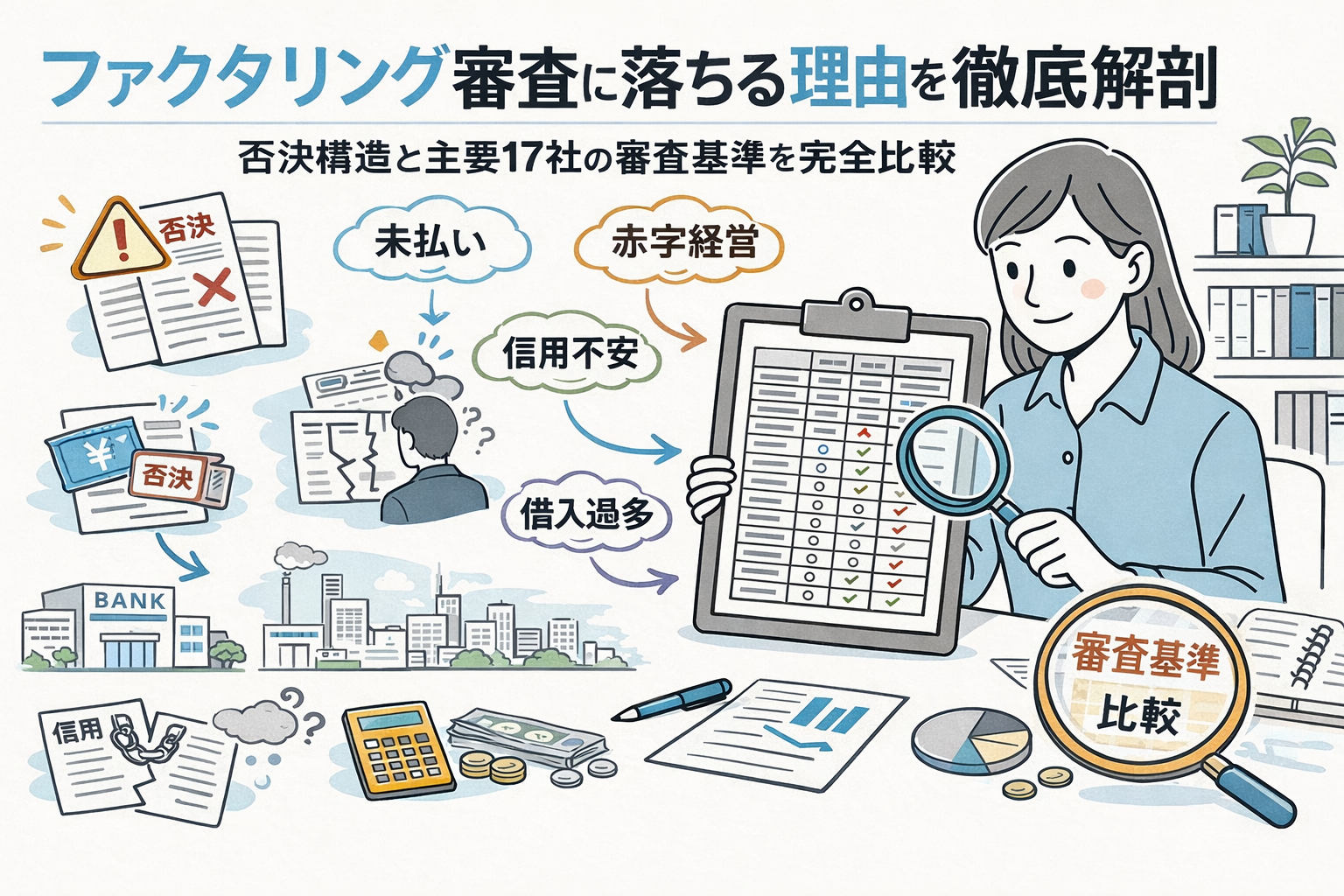 日本の中小企業および個人事業主を取り巻く金融環境において、売掛債権の流動化、いわゆるファクタリングは、デット・ファイナンスに依存しない機動的なキャッシュフロー改善策として確固たる地位を築いている。しかし、この資金調達手法の普及に伴い、利用者の前に立ちはだかる最大の障壁が「審査」というプロセスの不透明性と厳格化である。本報告書では、ファクタリング審査において否決(審査落ち)に至る論理的背景を多角的に分析し、指定された17の主要プロバイダーが有する独自の審査基準と市場における位置付けを網羅的に検証する。